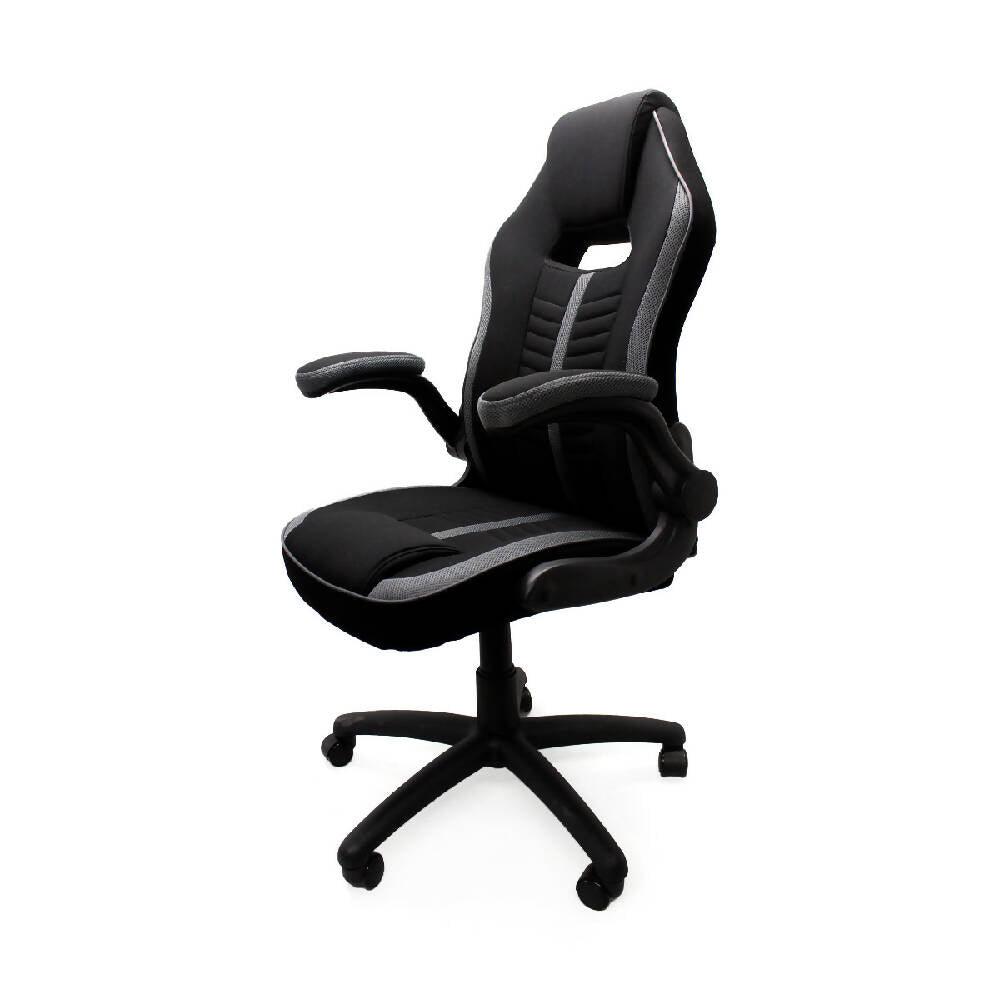 Silla con tejido negro y malla gris, reposabrazos ajustables, tiene mecanismo de elevación, bloqueo e inclinación, regulación de graduación de altura a gas (nitrógeno comprimido). Base de nailon arqueada y tiene ruedas de PU color gris que no rallan el piso.